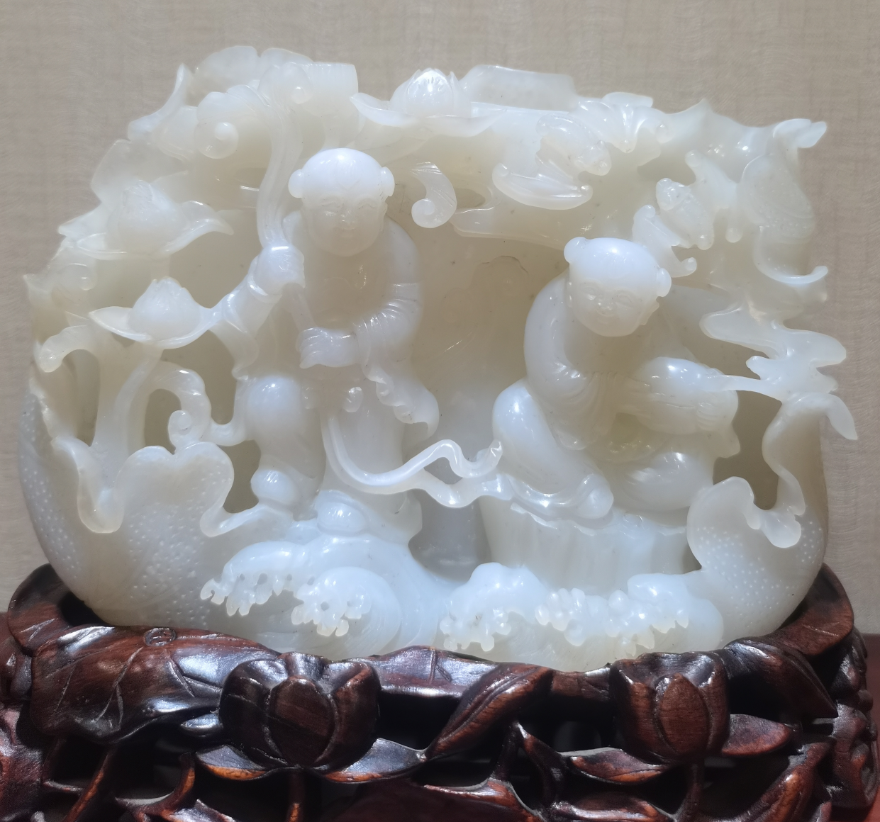 “合和二仙”象征“家庭和合,婚姻美滿”,進而延伸為“和合文化”、“和諧社會”、“和平世界”。此款擺件做人物件對料質(zhì)要求很高,將二仙歡樂暢快的情緒表現(xiàn)的尤為生動有趣,一人持荷,一人捧盒,惟妙惟肖;流露出喜氣洋洋的祥和氣韻,遍福飛繞,感染力強。作品對人物的形態(tài)動作,面部表情拿捏的十分準確,鏤空雕刻,雕工精湛,線條洗練,是一件工料具佳的和田玉擺件作品。