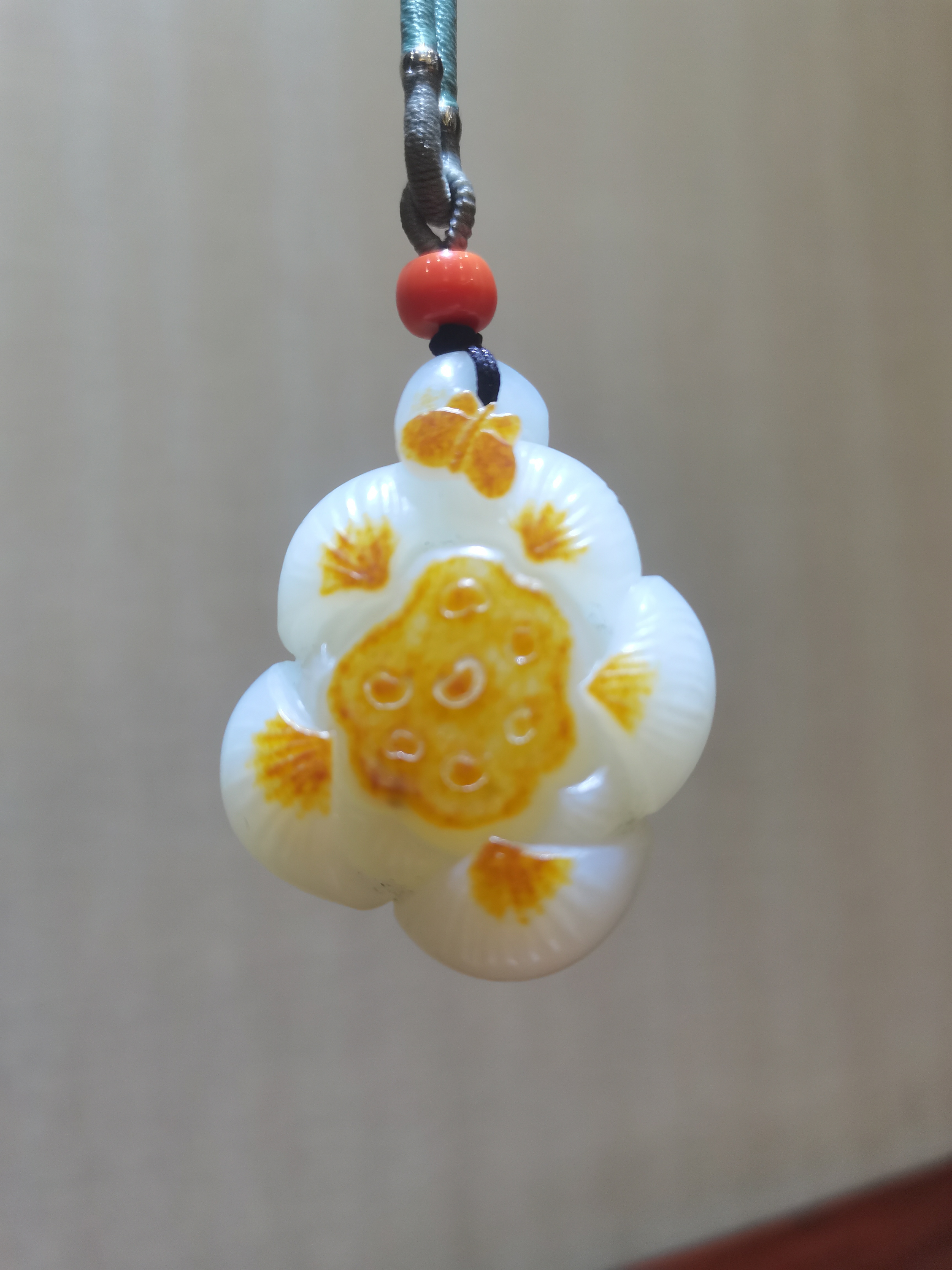 此款掛件玉質白皙,溫潤細膩,質地縝密,黃金沁色巧雕,蓮子圓潤飽滿、蝴蝶鮮活靈動,躍然指尖,是佩戴、賞、玩、藏之精品。