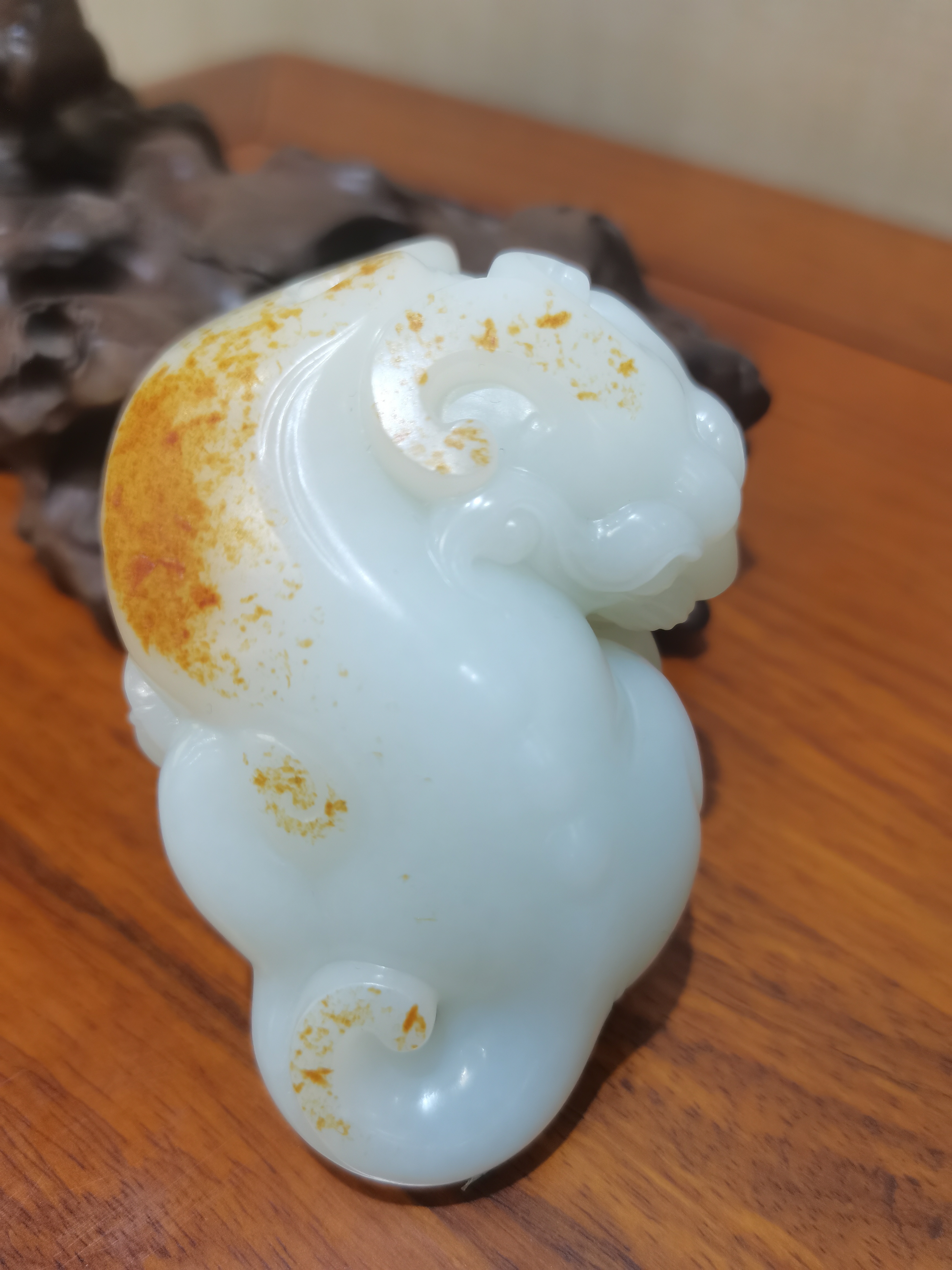 此款把件通體白皙,成色均勻,玉質(zhì)十分溫潤細膩;灑金皮色十分漂亮。造型圓潤飽滿、線條流暢、賦予張力,神態(tài)鮮活靈動,是為不可多得的收藏、傳世極品。