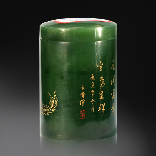 編號:0H1101-002 以上品碧玉琢成,玉質(zhì)溫潤細膩,色澤沉穩(wěn),器型規(guī)整圓潤,在布局上講究起承轉(zhuǎn)合,盒蓋和筒身淺浮雕詩文和花紋,字跡秀雅,線條婉轉(zhuǎn)雅致,雕琢精美秀麗,透露出古樸的氣息。細節(jié)刻畫上一絲不茍,整件作品的制作工藝嫻熟精湛,精致唯美,體現(xiàn)出了極高的工藝水平。