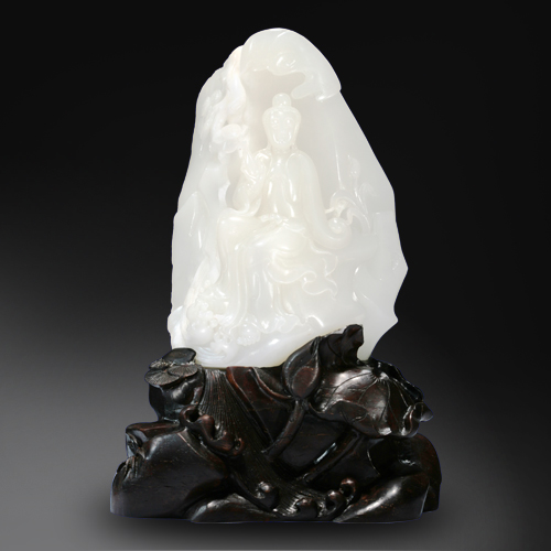 色潤白,玉色溫婉,油潤盈澤,滋潤細膩,高浮雕一觀音,端坐蓮花臺,背后疊嶂秀巒,觀音發髻高綰,慈眉善目,神態安詳,衣衫飄逸,背面簡潔雕刻山巒,刀法利落,整器厚重,恢弘大氣,雕琢細致入微,神態栩栩如生,技藝精湛,把觀音普渡眾生,保平安消災邪的美好形象表達得淋漓盡致,神蘊雕琢逼真到位。