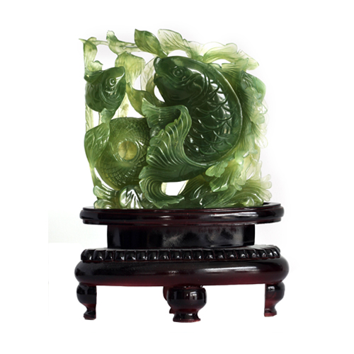 以翻騰的浪花為背景,左下角精心鏤空雕琢魚簍,兩尾鯉魚翹首翻騰,錯落有致,顯示出勃勃的生機,整體設計恰到好處。魚通“余”,有年年有余、世代富足之意。